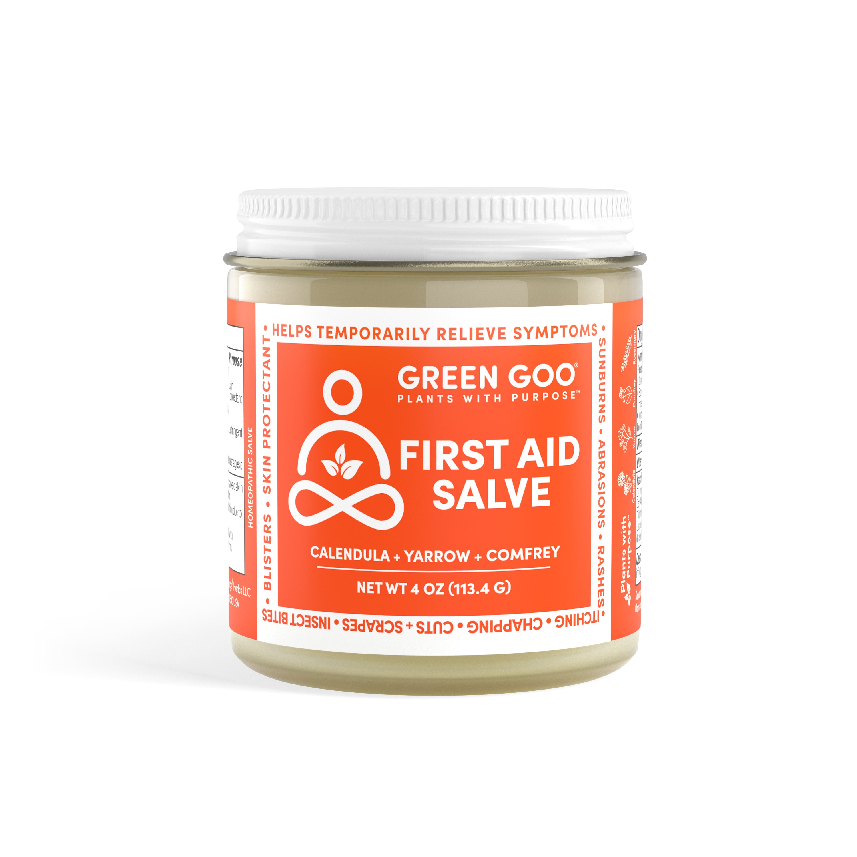Hands holding a tin labeled 'Green Goo First Aid' with a list of uses.